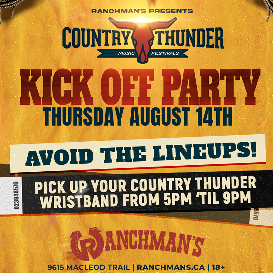 COUNTRY THUNDER KICK OFF PARTY AT RANCHMANS! Pick up your Country Thunder Alberta wristband at Ranchman’s from 5-9pm on Thursday, August 14th. Ride the bull, take our FREE Line Dance […]