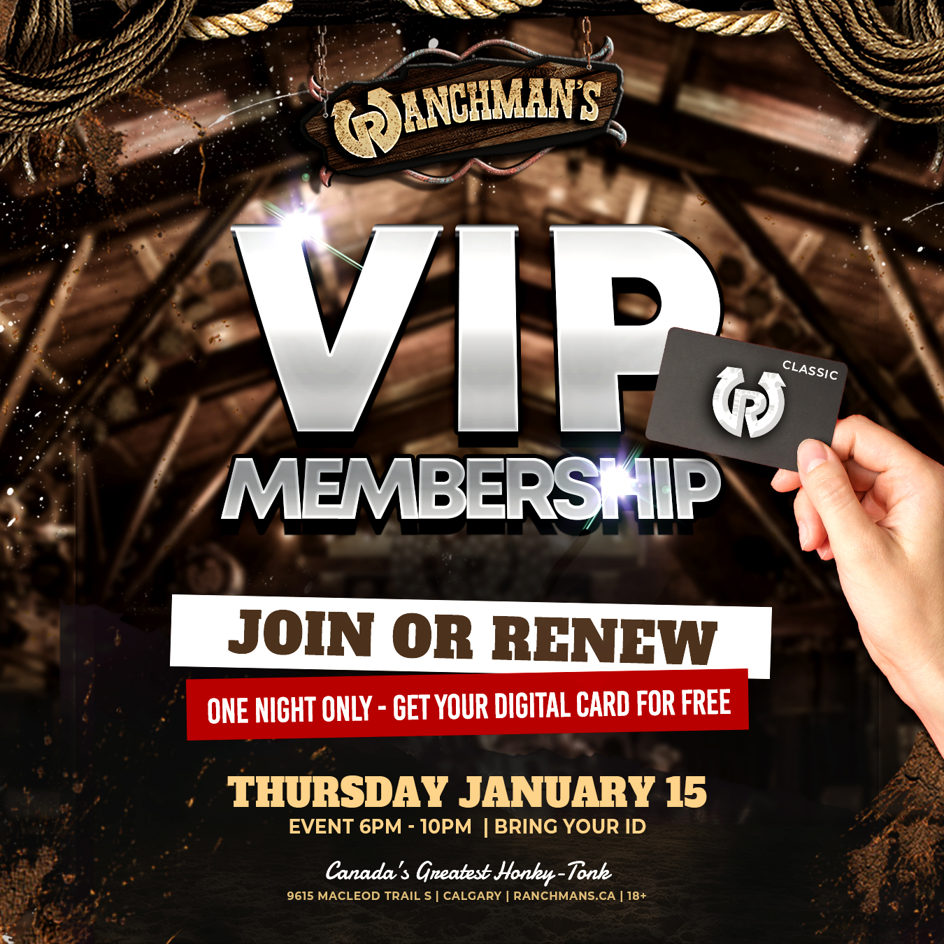 Want to hold an exclusive VIP Membership to Ranchman’s?! For ONE NIGHT ONLY: Join or renew your Ranchman’s Membership DIGITAL CARD for FREE on Thursday, January 15th 6pm-10pm.Simply bring your government issued photo ID. Must be 18+